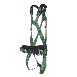 This construction harness is designed to deliver secure fall protection, comfort, and efficient adjustment for demanding work-at-height applications. Featuring back and hip D-rings, shoulder padding, and tongue-buckle leg straps, it supports stable positioning and all-day wear. The integrated QWIK-FIT chest connection simplifies donning while providing a close, comfortable fit without bulky chest straps. Pull-down adjustment allows the harness to be quickly set and maintained throughout the workday.